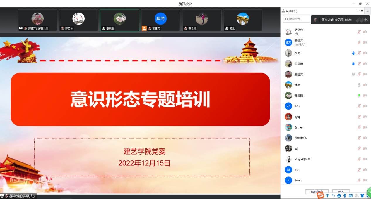 接着,秦思阳开展意识形态工作专题培训,强调高校意识形态工作的极端重要性,全体教师务必自觉加强课堂、教材、讲座等阵地的管理,防范和化解各种潜在风险,营造良好的育人环境,落实好立德树人根本任务。