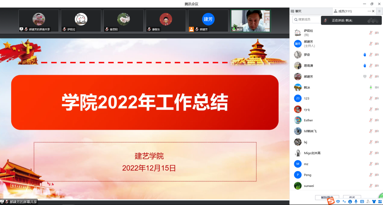 首先,院长韩冰就党建及思想政治工作、人才培养、科学研究、学科建设、人才队伍建设、对外交流合作、外联及社会服务、学院治理等方面进行了2022年度学院工作总结。