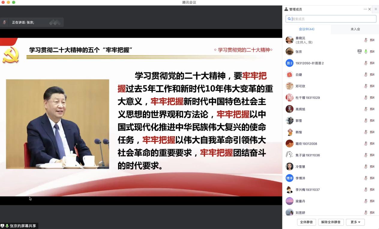 七位学院党委委员分别走进所联系的学生党支部,为学生党员讲授“深入学习贯彻党的二十大精神”党课。各教师党支部由支部书记讲授党课,并结合专业特点与支部成员分享“中国式现代化的内涵”。在党课上,主讲人重点回顾了十八大以来中国进入新时代十年所取得的举世瞩目的重大成就,阐释了新时代新征程中国共产党的使命任务,强调要始终高举中国特色社会主义伟大旗帜,全面贯彻新时代中国特色社会主义思想,弘扬伟大建党精神,为全面建设社会主义现代化国家、全面推进中华民族伟大复兴而团结奋斗!