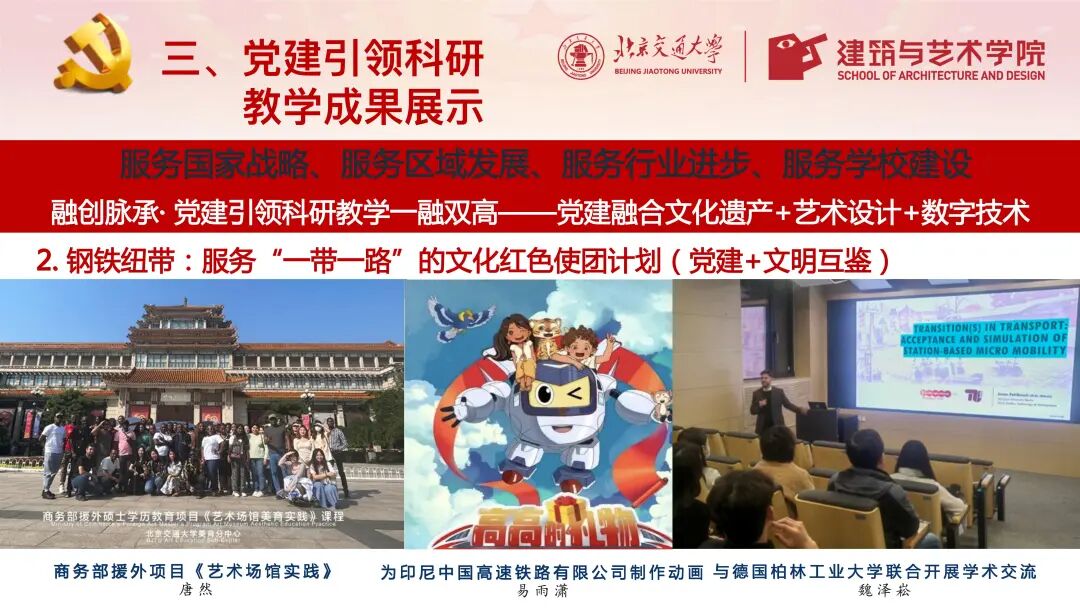 集体记忆是立德树人的情感纽带、文化基因是课程创新的内容源泉、遗产景观是教育实践的活态实验室、交叉设计打通从认知到践行的转化通道。设计系教师党支部以“融创脉承· 党建引领科研教学一融双高”为目标,凝练党建融合文化遗产、艺术设计、数字技术的特色工作方法。
