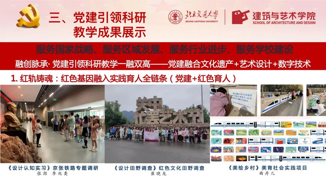 “红轨铸魂”育新人: 将红色基因融入实践育人全链条,秉承“没有调查就没有发言权”,打造思政实践金课。在铁轨的延伸中感悟中华民族“独立自主、科技自强”的脊梁;用千年瑰宝点燃青年人的文化自信;将“以人民为中心”的创作观,扎根在希望的田野上!