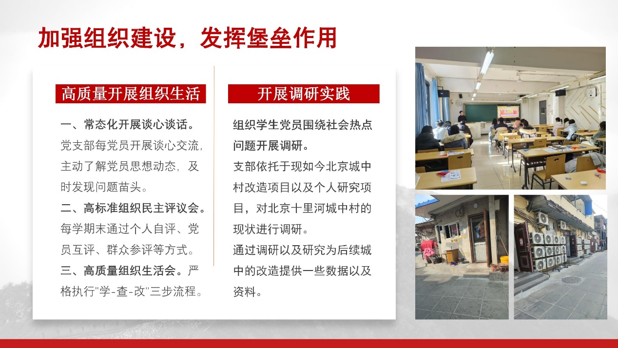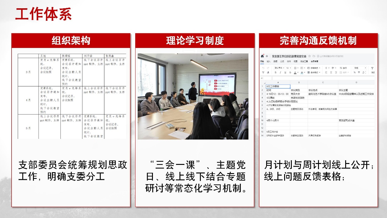 在工作体系建设上,我们规范的组织架构:支委会统筹规划思政工作,明确分工责任。建立“三会一课”、主题党日、线上线下专题研讨的常态化学习机制,完善沟通反馈机制,通过党支部工作日历和意见交表,提高工作效率。