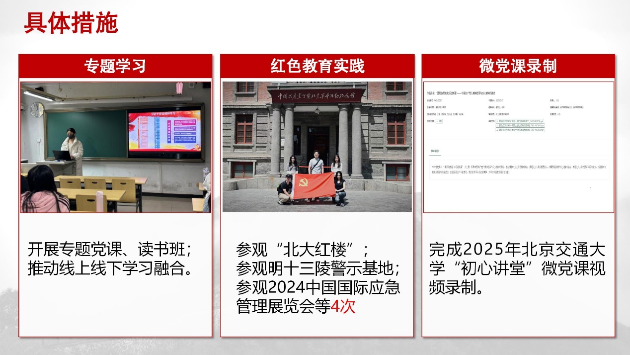 在专题学习方面,开展专题党课、读书班等;在红色教育实践中,我们走进“北大红楼”、明十三陵警示基地等,累计开展4次实地研学;完成2025年98堂 “初心讲堂”微党课视频录制,以创新形式传播红色声音。
