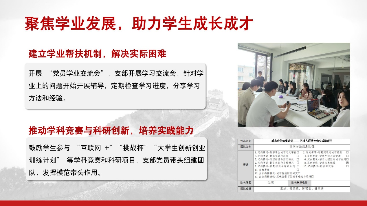 我们建立学业帮扶机制,开展“党员学业交流会”,通过定期交流学习难题。在学科竞赛与科研创新中,鼓励参与“互联网+”“挑战杯”等赛事。