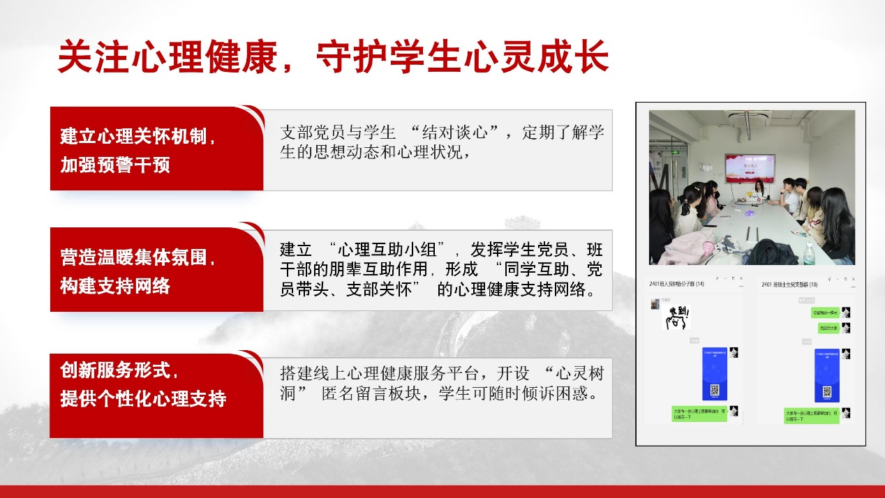 同时支部关注心理健康,守护学生心灵成长构建“同学互助、党员带头、支部关怀”的心理健康支持网络:支部党员与学生“结对谈心”,建立“心理互助小组”,搭建线上“心灵树洞”匿名留言平台。