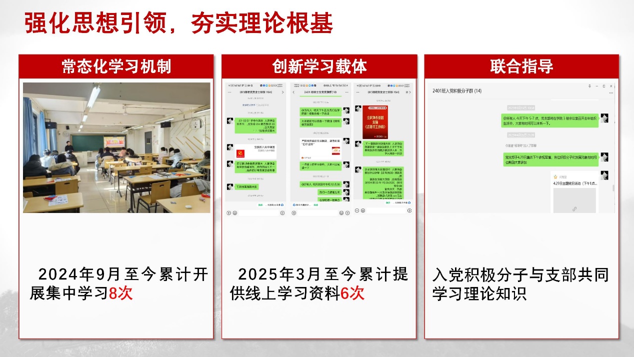 我们以“坚定信念、立德树人、筑牢思想防线”为核心,引导支部成员深入学党的思想,将思政教育融入成长全过程,防范错误思潮影响。