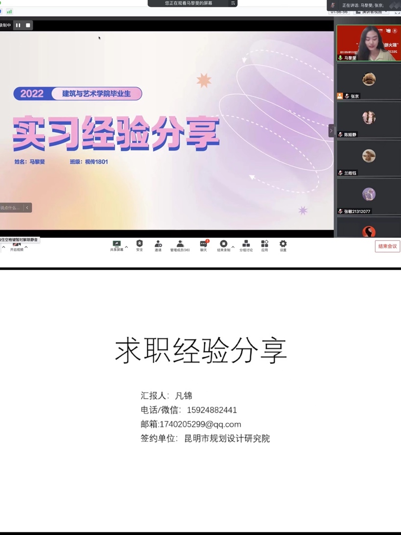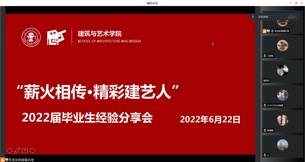 为了提升在校生学业与职业生涯规划意识,积极面对学业就业压力,6月23日下午,98堂 通过腾讯会议平台举办“薪火相传,精彩建艺人——学长来了”毕业生经验分享会。分享会邀请了学院22届毕业生兰皓钰、马舒媛、杨小乐、王浩骏、马黎斐、凡锦六位同学为19、20、21级在校生做升学、出国、求职经验分享。本次分享会吸引近100名在校生收看交流,会议由学院学工办主任张京主持。