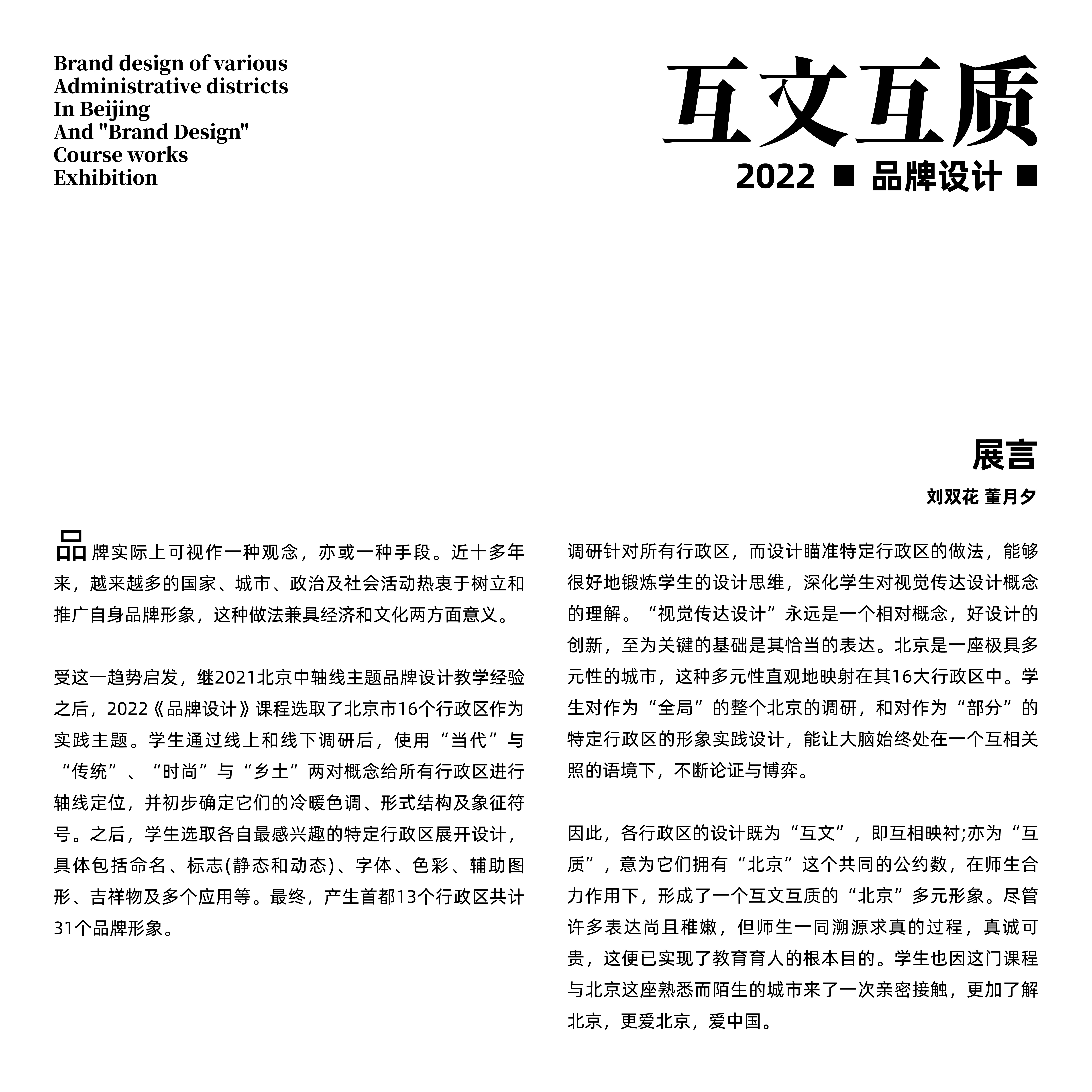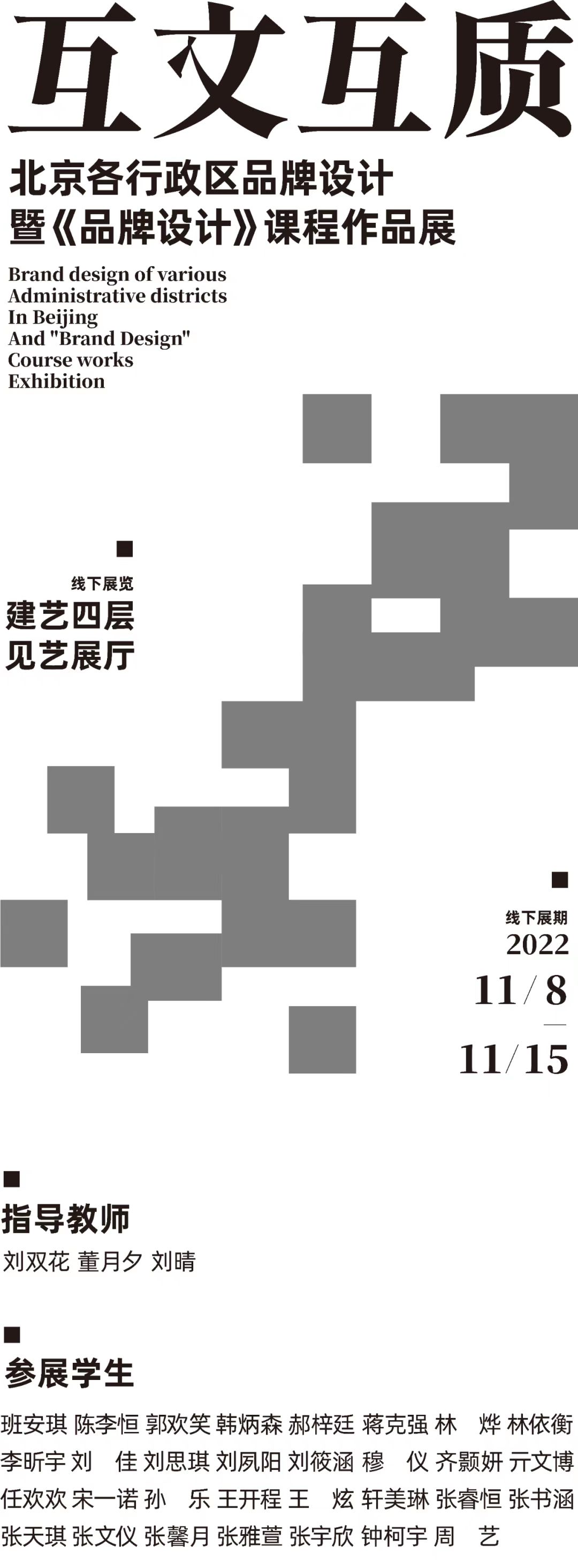 10月底至11月初,98堂 第11工作室在导师刘双花、董月夕指导下,带领工作室成员及2001班部分同学,共同为为期六周的《品牌设计》课程策划了线上和线下展览。11月9日,名为“互文互质|2022《品牌设计》课程作业展”如期开展。展览展示了工作室成员及所在班级2001班同学的课程成果,包括东城、西城、朝阳、海淀、丰台、顺义、通州、石景山、延庆、怀柔、房山、门头沟、密云等13个首都行政区的品牌形象设计。