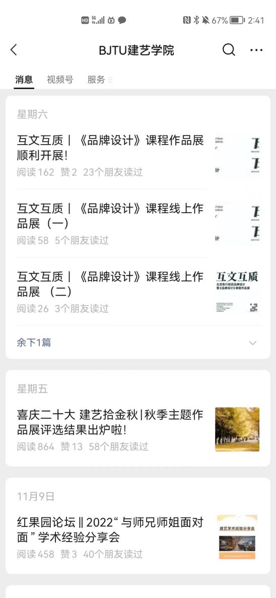 由工作室成员轩美琳组织三位策展同学进行商议并明确同学分工,确定本次线上展分为三个篇目,按照城区风格类别来进行篇目划分,展示方式主要以每位同学LOGO,字体,辅助图形,吉祥物,相关衍生应用等VI视觉识别系统制作的长图为主,并辅以设计说明和动态LOGO视频等进行展示。由工作室老师进行指导建议并为本次展览撰写导言后,同学们分工协作,制作三篇展览推送和一篇新闻稿,并被北交大艺术,BJTU建艺学院等公众号转载。