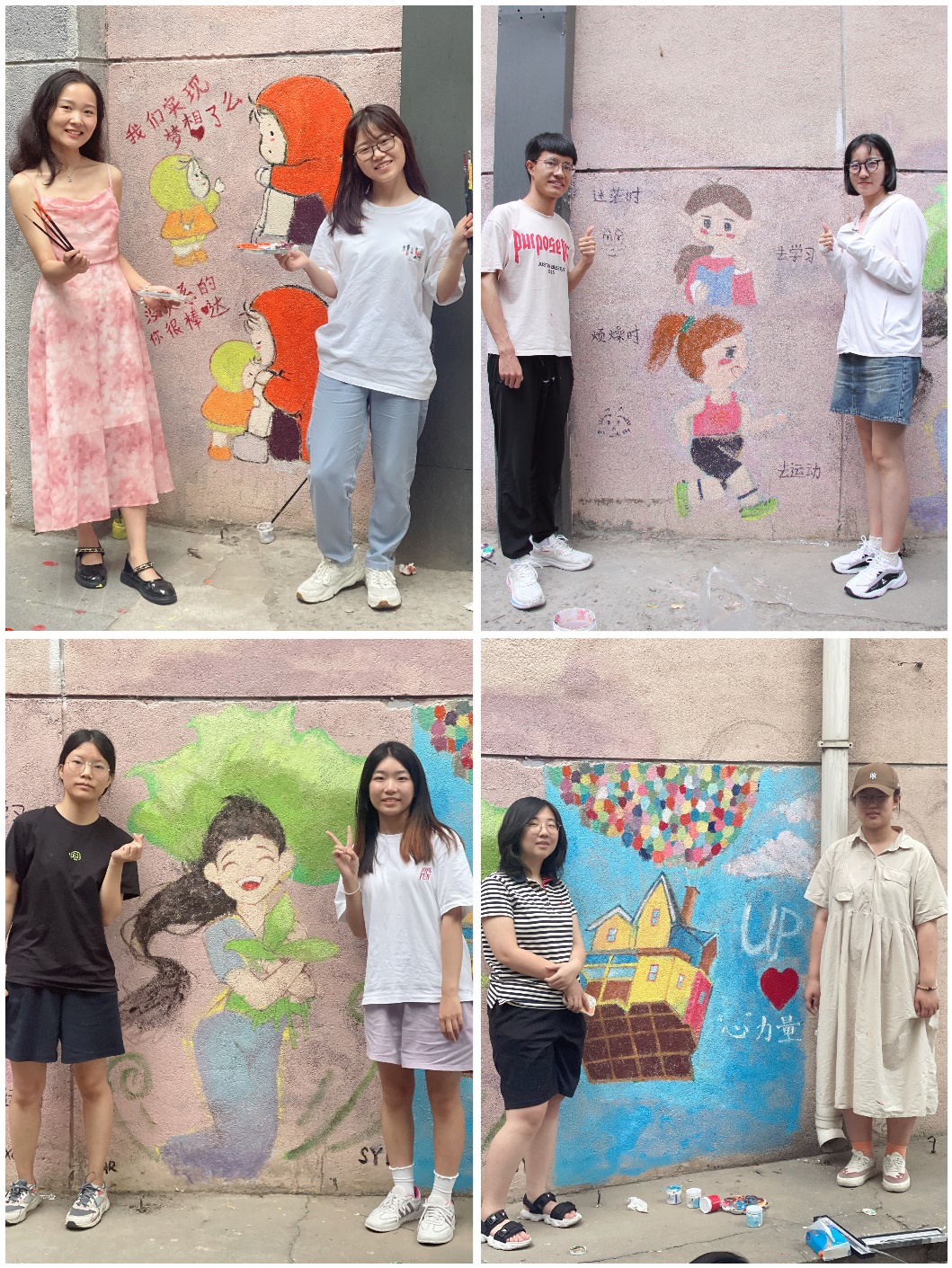 本期“艺旅•心声”的主题是墙绘心理漫画。四位朋辈导师先向大家介绍了墙绘的方法及注意事项,并协助指导参与者完成心理漫画的创作和绘制。通过墙绘心理漫画,不仅使参与者放松身心,作品内容更是传递积极的正能量,活动过程中引来很多同学和老师驻足围观。此次墙绘作品也成为了校园一道亮丽的风景,用艺术的方式,为今后经过此地的人们赋能。