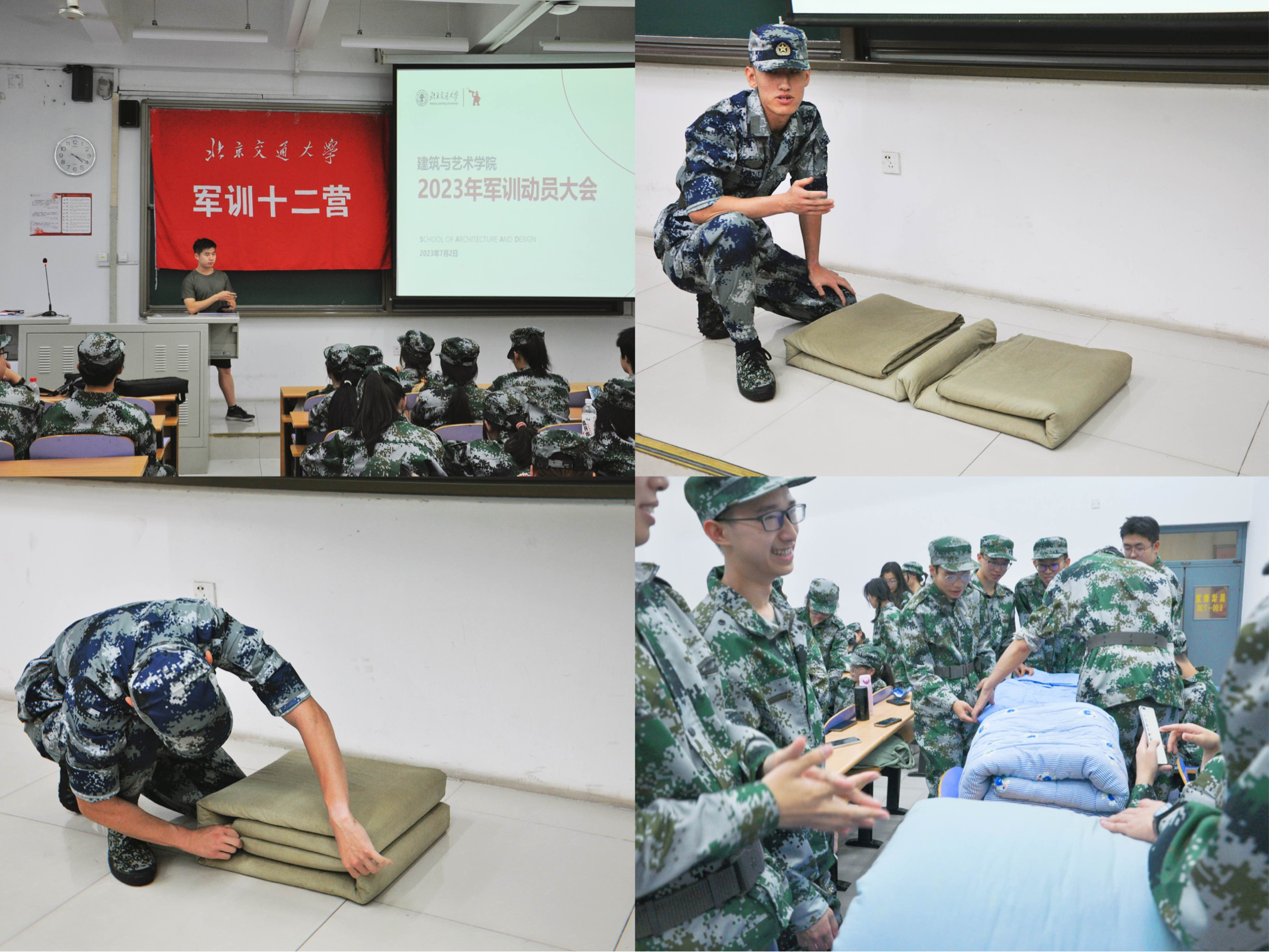 动员大会的最后,学院两名退伍大学生士兵为同学们讲解和演示了军被整理的方法。全体同学开始实地演练起来,互相帮助互相交流,用实际行动,吹响军训的集结号。