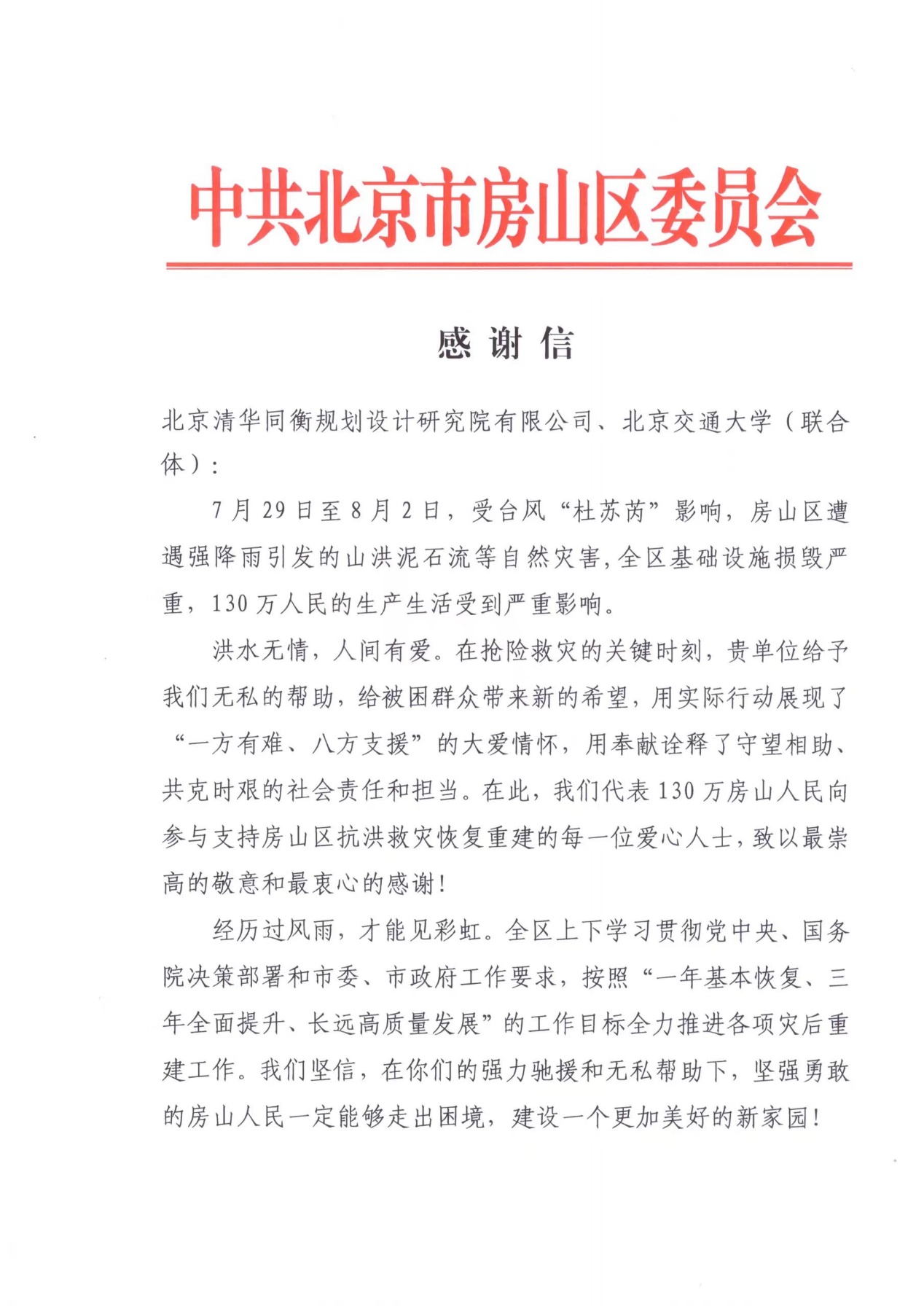 北京市房山区委区政府在感谢信中提到,7月29日至8月2日,房山区遭遇强降雨引发的山洪泥石流等自然灾害,在抢险救灾的关键时刻,98堂 给予房山区无私的帮助,用实际行动展现了大爱情怀,用奉献诠释了高校的社会责任和担当。房山区灾后重建工作由建艺学院副院长佘高红,城乡规划系主任王鑫,副主任张纯,朱高儒、徐凌玉、徐高峰、张威涛等多位教师组建师生团队参与。