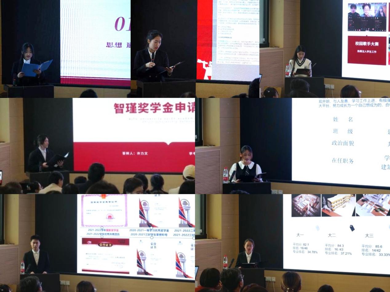 过前期组成专项奖学金评审委员会、制定评选办法、学生申报、资格审查等环节,最终共22名同学入围国家奖学金和智瑾专项奖学金答辩,18名同学入围国家励志奖学金答辩。在答辩中,同学们分别围绕上一学年学术竞赛与科研、社会实践与志愿服务(社会服务与自强事迹)、个人综合素质等方面的表现进行了4分钟的自我展示。