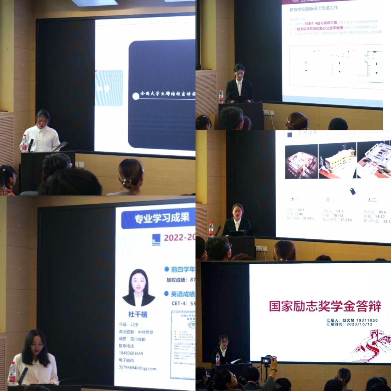 10月11日、10月12日,建艺学院在建艺楼一层报告厅分别举行2022-2023学年国家奖学金和智瑾专项奖学金、国家励志奖学金展示会。学院党委副书记刘萍,副院长张野,建筑系主任盛强、副主任曾忠忠,城乡规划系主任王鑫、副主任张纯,设计系主任王征、副主任杨梦婉,教学科科长彭烜,学生工作组全体人员,2023级学生代表担任答辩会评委。