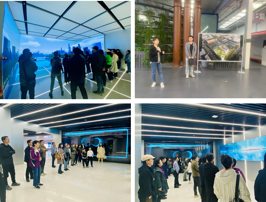 随后学院一行来到张家湾设计小镇。老师们考察了元宇宙应用创新中心和北京未来设计园区。相关负责人详细介绍园区转型升级、科技创新等情况,沉浸式的互动体验展现数字技术与未来生活。大跨度的空间内,简洁的装修、透亮的玻璃、成排的绿植,在科技、生态、共享的老铜牛厂改造中充分感受了“国际设计之都的主平台”、“城市科技应用的样板区”和“24小时活力示范区”。城野交融、新老相映,在千年古镇张家湾,一座以设计文创和科技创新为特色的小镇,正在崛起。