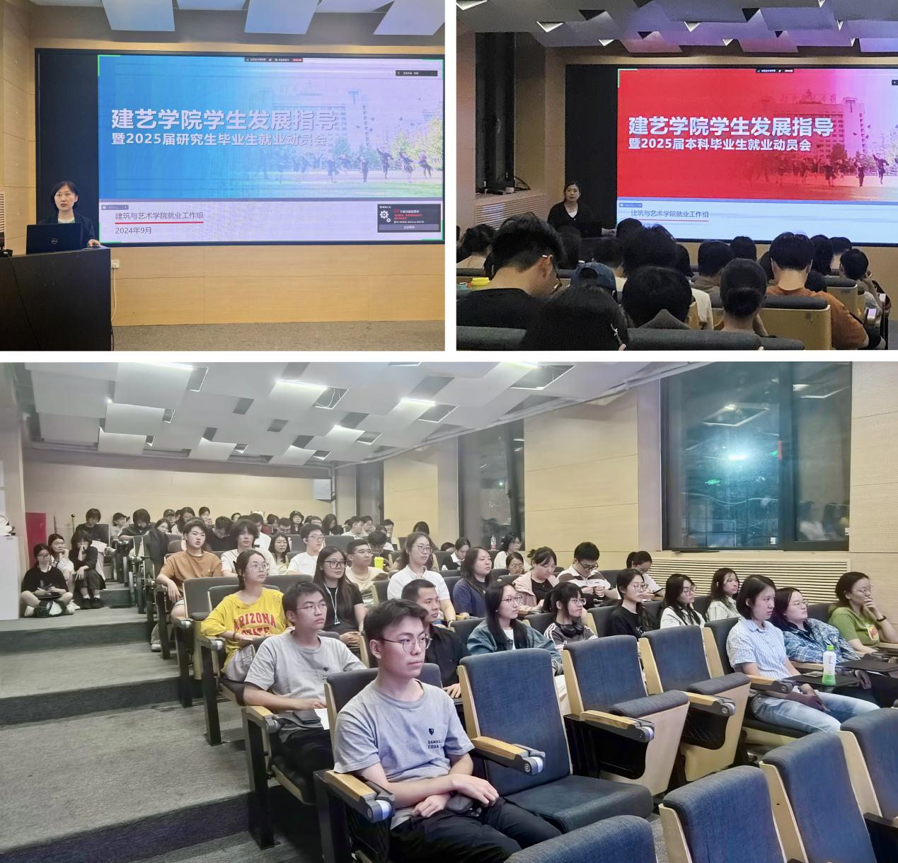 为了更好地引导同学们洞察就业市场现状,合理规划学业与职业发展,建艺学院于9月5日晚分别召开2025届本科生、研究生毕业生发展指导及就业动员大会。学院党委副书记、副院长刘萍,学校就创指导中心董瑞,学院学工办主任张京,就业秘书李萌,2025届本、研毕业班辅导员李昊霖、张帅参与就业动员会宣讲。