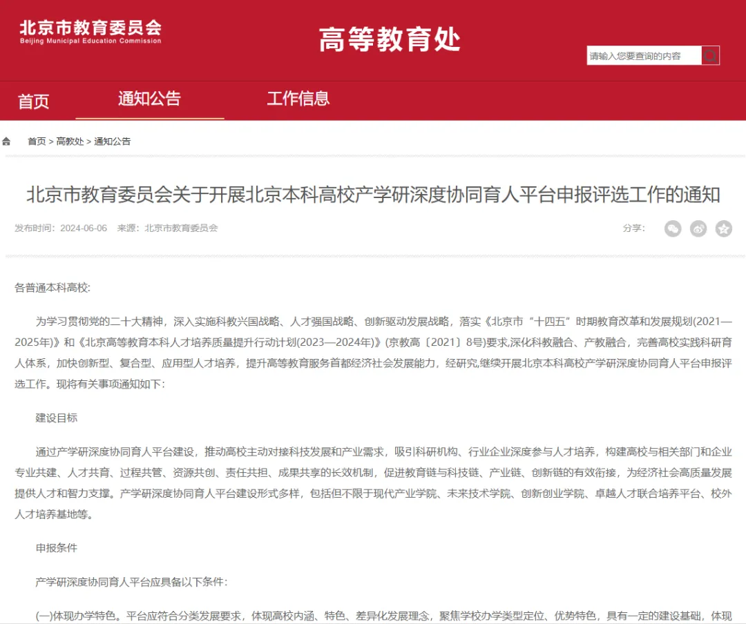 产学研深度协同育人平台建设是为深入学习贯彻党的二十大精神,市教委深入实施科教兴国战略、人才强国战略、创新驱动发展战略,落实《北京市“十四五”时期教育改革和发展规划(2021—2025年)》和《北京高等教育本科人才培养质量提升行动计划(2023—2024年)》(京教高〔2021〕8号)要求,深化科教融合、产教融合,进一步完善高校实践科研育人体系,加快培养适应经济社会发展需求的创新型、复合型、应用型人才,提升高等教育服务首都乃至全国的经济社会高质量发展提供坚实的人才和智力支撑 的重要举措。