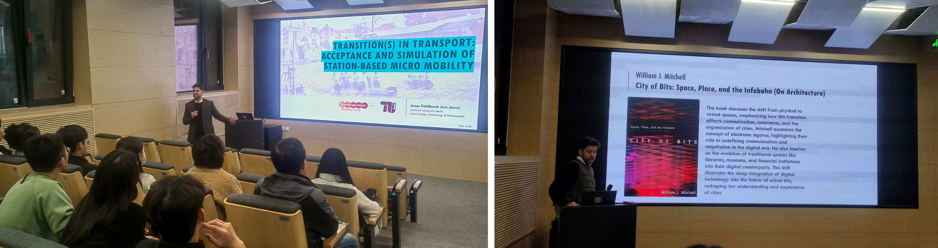 2024年10月28日-11月6日,建艺学院设计系“2024年中德高校智慧城市设计研究生教学实践与交流”项目负责人魏泽崧老师邀请德国柏林工大智慧城市研究所“Mobility2Grid德国城市战略”项目主持人Jonas Fahlbusch博士,为研究生进行了《交通规划设计的未来机遇与局限》、《城市与景观规划中的开放数据》等多个专题的授课与讲座。