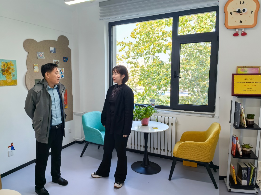 张驰对学院二级心理工作站建设进行指导,对心“晴”聊天室陈设布置、艺术疗愈活动开展等方面提出建议。他肯定了学院为学生心理健康工作做出的努力,双方就今后合作开展表达性艺术治疗的可能性达成初步意向。