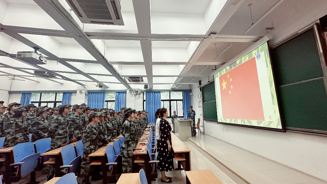 李圣哲带领同学集体宣誓,做到“军训期间,服从命领;听从指挥,尊重教官;刻苦训练,遵守纪律;磨练意志,不怕困难;争做标兵,为院争光”。