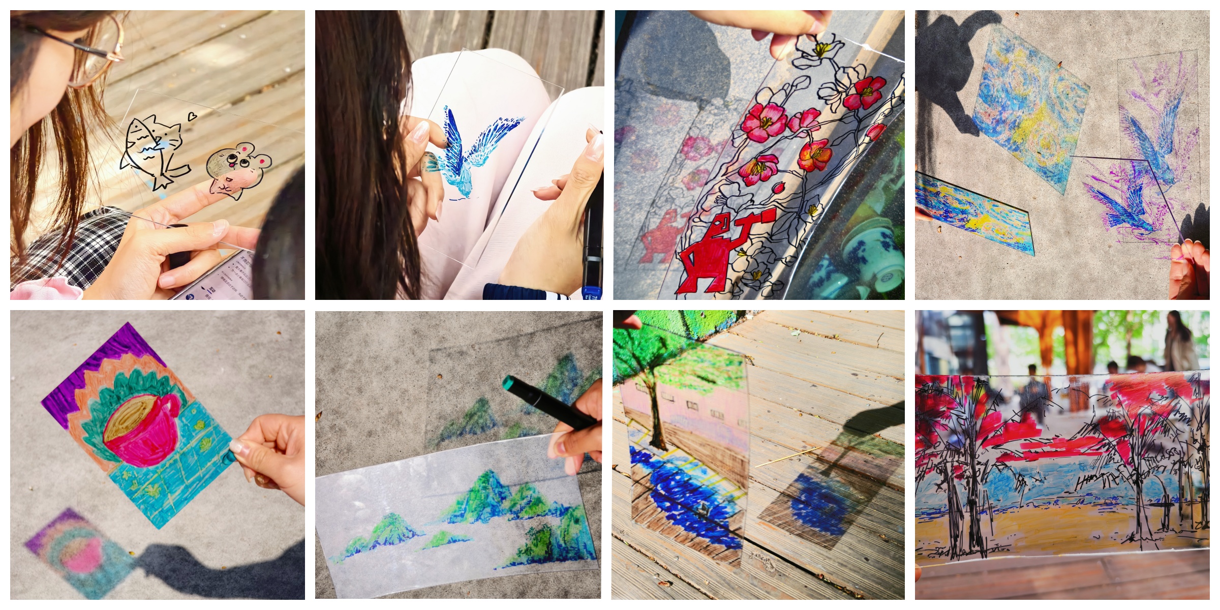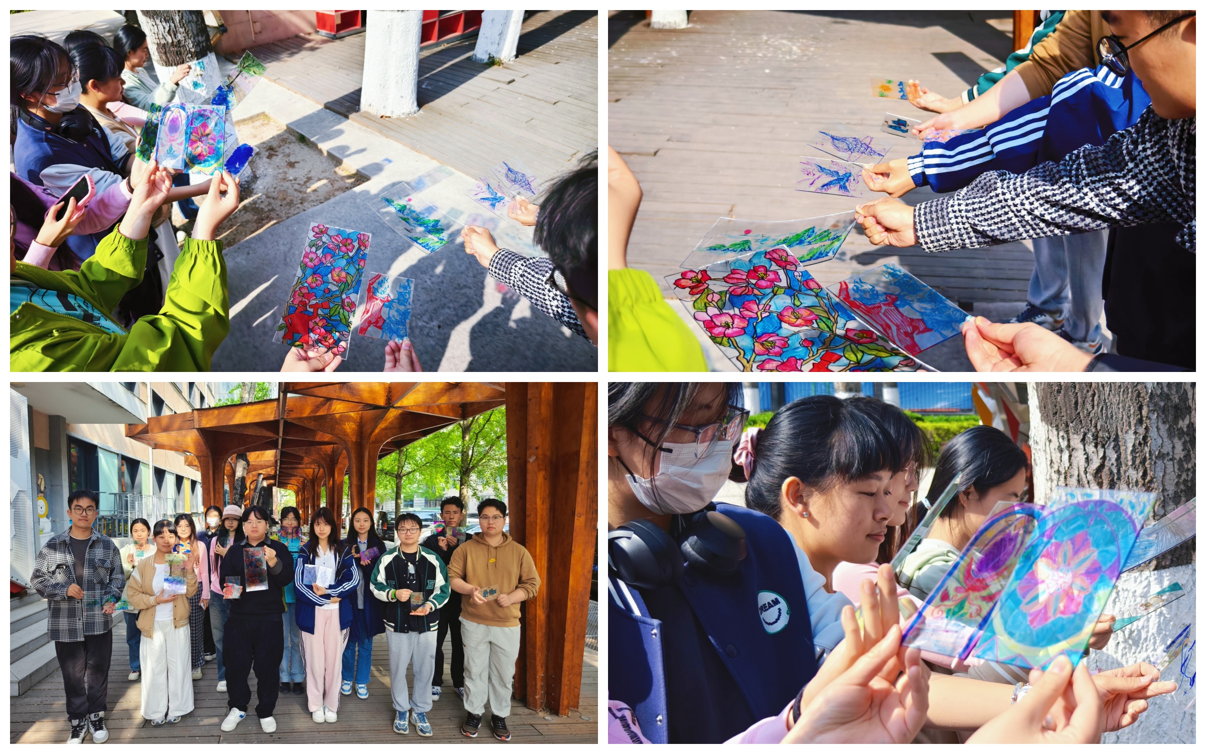 本次活动的创作形式为彩色玻璃画,建艺学院学工办主任张京带领参与者专注于自身的情绪,回想曾经感受到压力的时刻,并思考通过何种方式能够缓解内心的压力。接下来,朋辈导师引导参与者将缓解压力的方法画出来,并将情绪转化为颜色,在透明的玻璃上精心勾勒轮廓、填充色彩。坐在伞亭内,享受着微风,让大家更加沉浸在艺术创作的宁静与美好之中,分享作品创作和自己调节压力的方法。创作完成后,师生们手持玻璃画作品移步至阳光下,光线穿过化作,五彩斑斓的色彩在地面上晕染开来,交织出如梦似幻的光影。