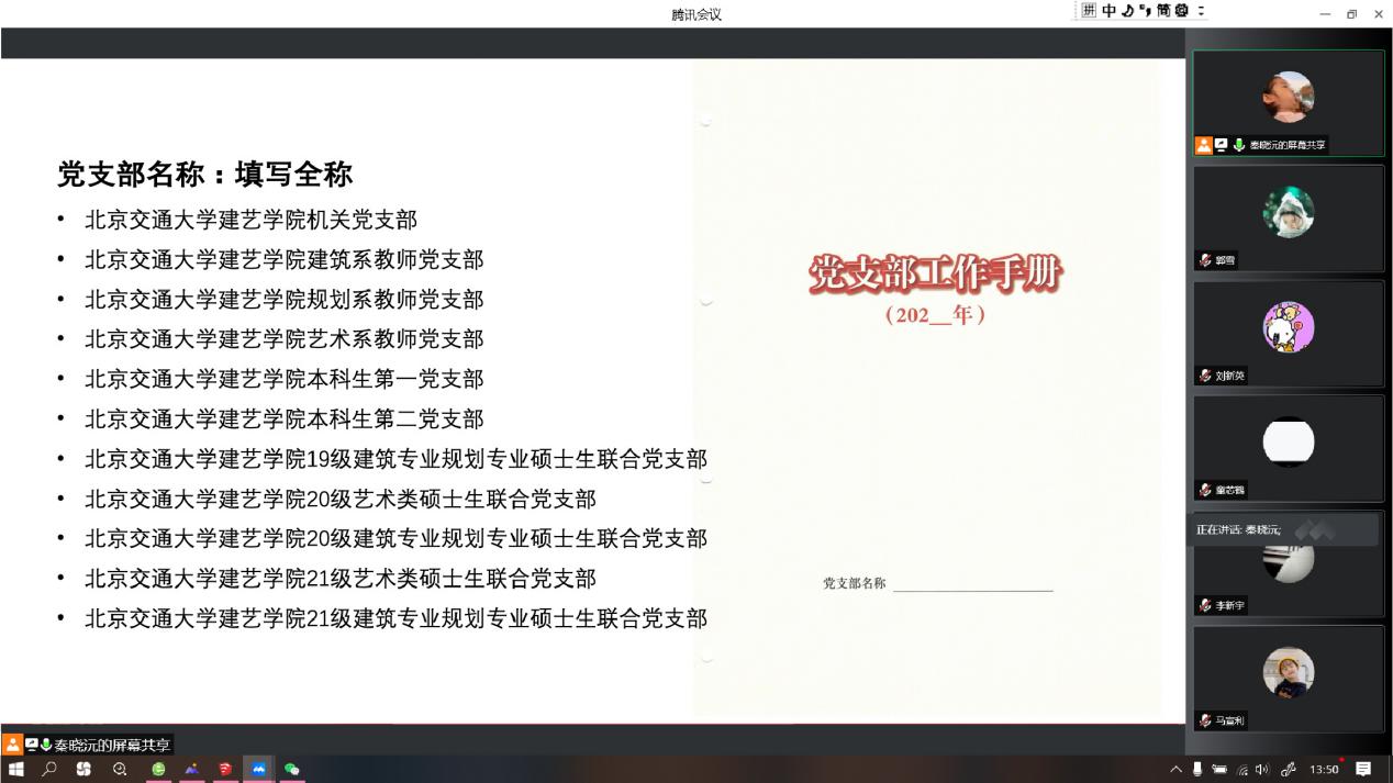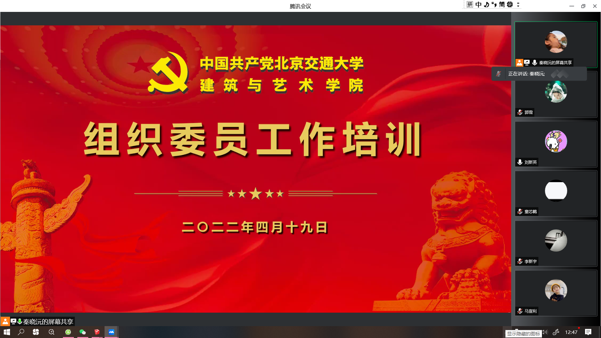 为了进一步加强和规范学院基层党建工作,4月19日中午,建艺学院党委举行各党支部组织委员工作培训会。学院党委书记秦思阳,全体教职工党支部组织委员、部分学生党支部组织委员线下参加,其余学生党支部组织委员线上参加。会议由学院党委书记秦思阳主持。