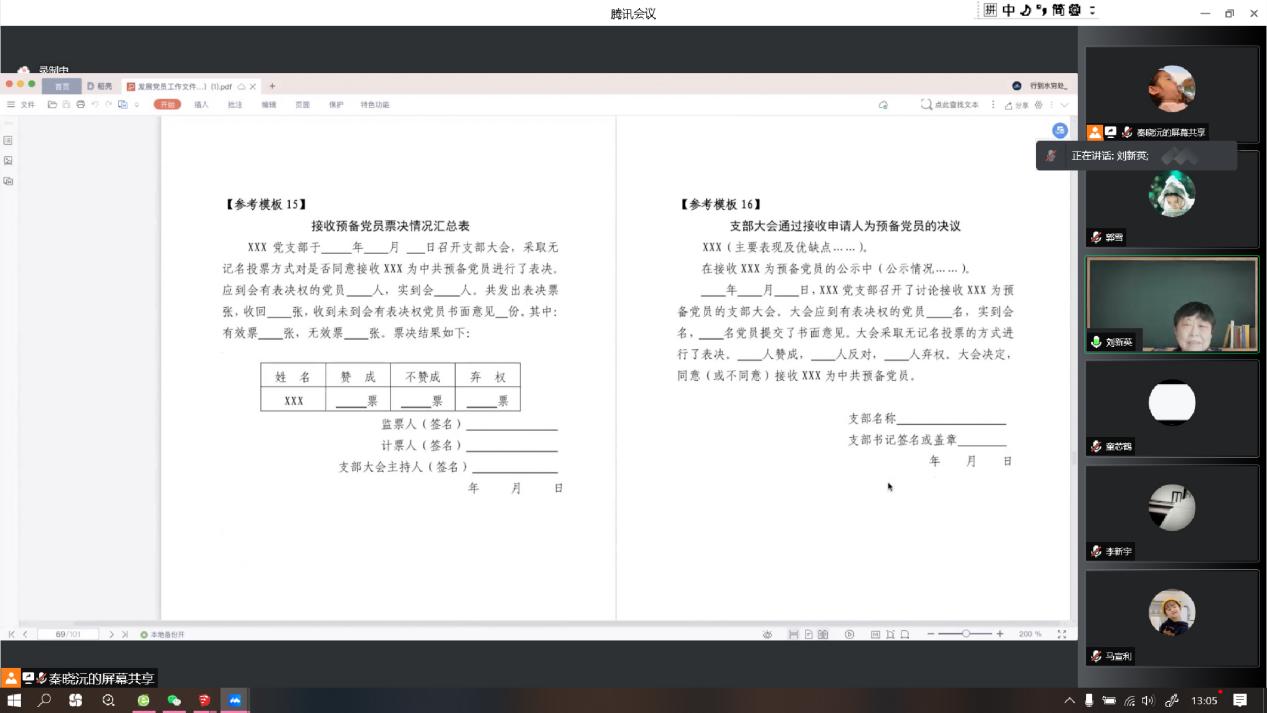 本科生第二党支部书记秦晓沅带领全体组织委员学习了《党支部工作手册》填写规范和注意事项,明确了《党支部工作手册》填写标准,并就党员E先锋系统、党费系统的具体使用方法及常见问题对组织委员进行了培训。