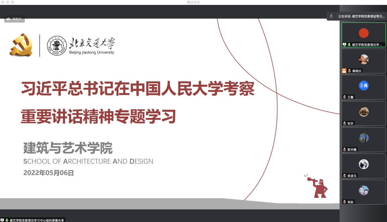 2022年5月6日,建艺学院党委理论中心组深入学习习近平总书记在中国人民大学考察时的重要讲话精神,会议由学院党委书记秦思阳主持,学院党委理论中心组机关人员现场参会,各教师党支部书记线上参加会议。