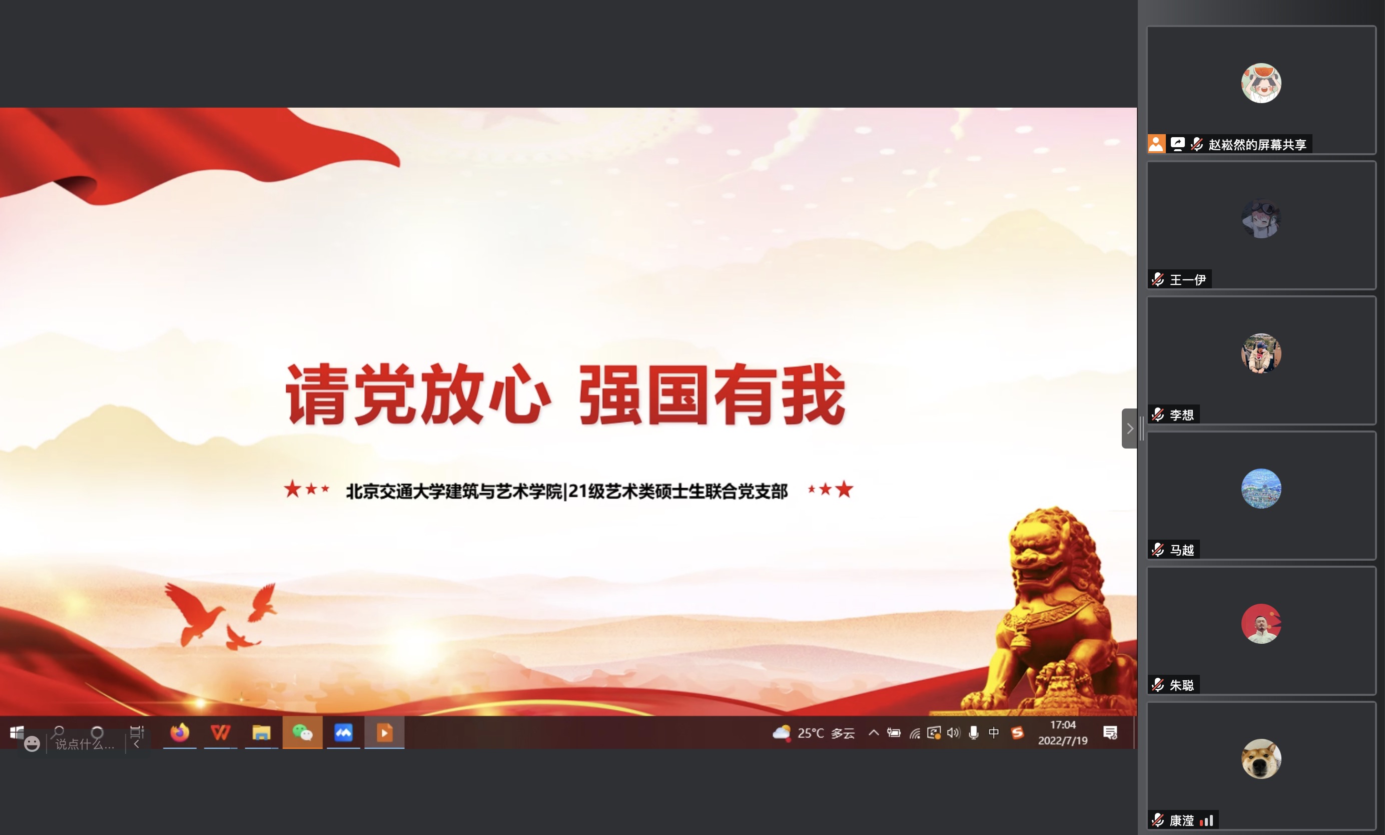 在全国上下喜迎党的二十大召开之际,我们迎来了中国共产党成立101周年。为提升新时代基层党组织组织力,进一步激励各党支部和广大师生党员在打赢疫情防控阻击战和推动学院高质量发展中发挥战斗堡垒作用和先锋模范作用,建艺学院21级艺术类硕士生联合党支部以“请党放心、强国有我”为主题开展庆祝中国共产党成立101周年主题党日活动。